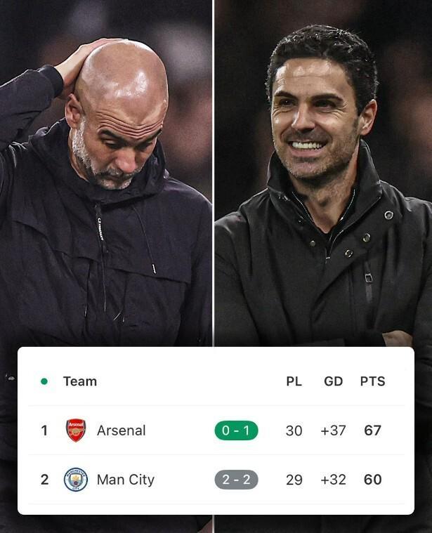 积分榜方面,阿森纳队30场过后20胜7平3负积67分,继续排名积分榜首的位置。曼城队少赛1场18胜6平5负积60分,在联赛冲刺阶段,已经被阿森纳拉开了7分的差距。